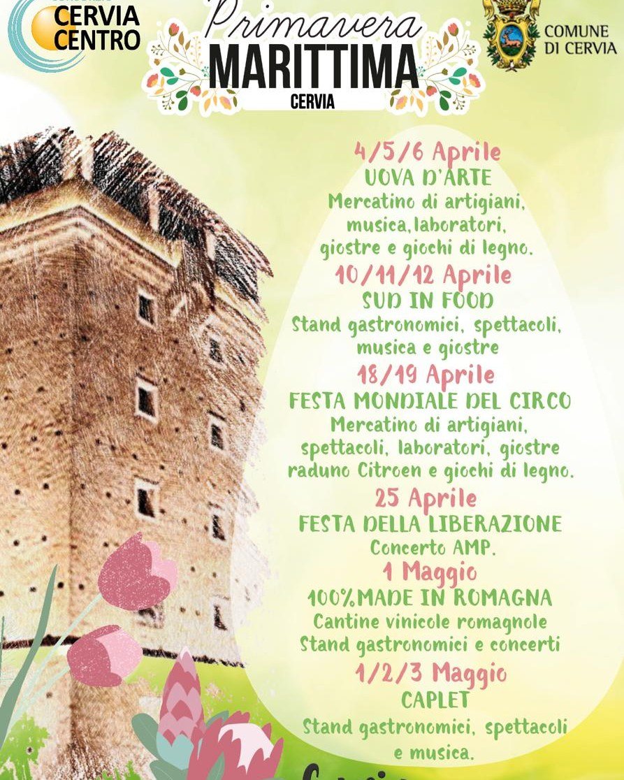 Das Zentrum von Cervia wird jedes Wochenende und an den Frühlingsfeiertagen mit zahlreichen Veranstaltungen, Ausstellungen, Märkten, regionaler Gastronomie, Kunsthandwerk und Shows für Groß und Klein belebt.